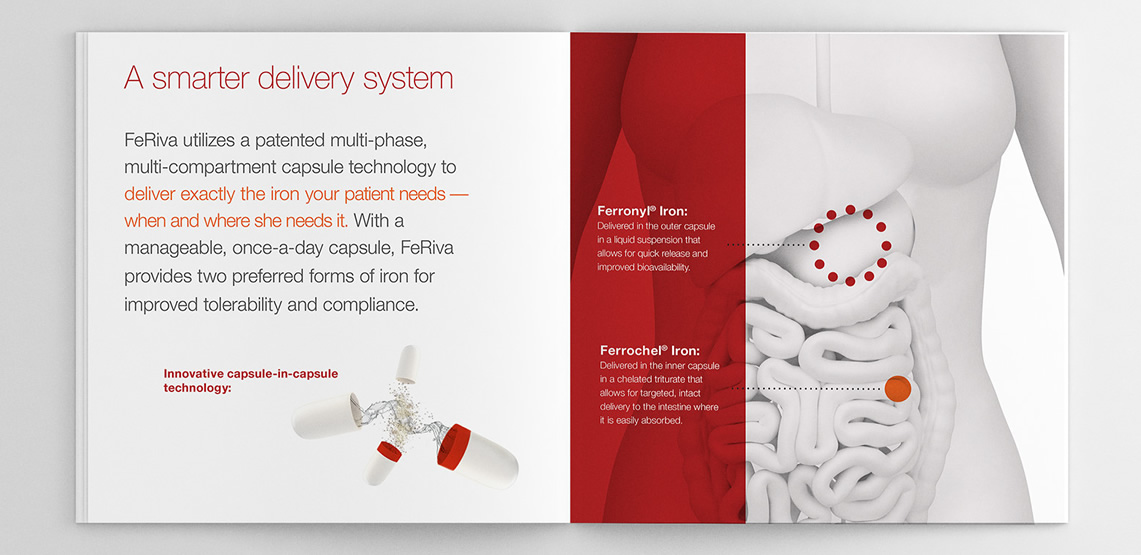 Sometimes the best way to capture a complex value proposition is through a descriptive visual, something we achieved with our FeRiva branding. With the dotted circle and solid circle representing the two different types of iron in the formulation, coupled with evocative red accents,
