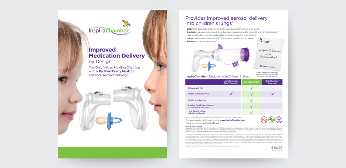 Pediatric pharmaceutical devices and products are a great avenue for showcasing playfulness and creativity within a regulated industry. The bright color scheme and cheerful parrot character for InspiraChamber were designed to pair well with a pediatric-targeted product and appeared across